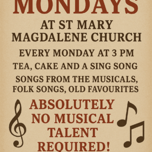 At St Mary Magdalene ChurchEvery Monday at 3pm Tea, cake and a sing song. Songs from the the musicals, folk…